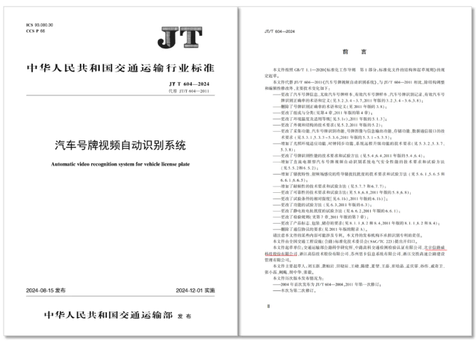 近日,《汽车号牌视频自动识别系统》行业标准正式公布,标准由全国交通工程设施(公路)标准化技术委员会(SAC / TC 223)提出并归口,主管部门为交通运输部,将于2024年12月1日起正式实施。标准起草单位包括交通运输部公路科学研究所、中路高科交通检测检验认证有限公司、北京信路威科技股份有限公司、浙江高信技术股份有限公司、苏州思卡信息系统有限公司、浙江交投高速公路建设管理有限公司。