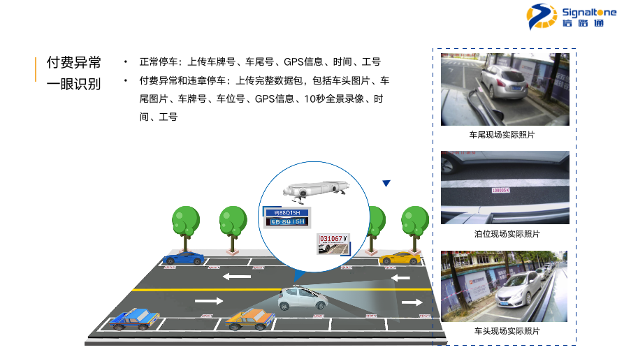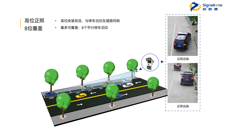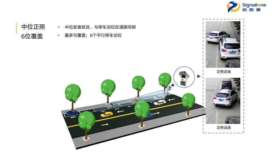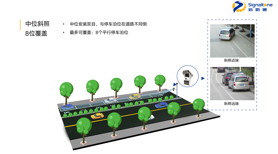 “双目”采用500万的高清双摄像头,对平行于道路行进方向设置的停车泊位进行智能管理。核心指标上,双目车辆捕获率超97%,车牌识别率超98%,多检率低于5%。根据现场环境可选择高位或中位安装,左边是我们高位正照的效果图,一个双目可覆盖8个泊位,右边是远近两端的正照。接下来是可覆盖6个泊位的中位正照效果图及远近两段的正照,以及可覆盖8个泊位中位斜照效果图及远近两段的斜照。
