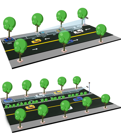 ◉ 高位正照:安装于停车泊位道路同侧,最多可覆盖8个泊位