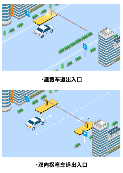 超宽车道、双向拐弯车道出入口,辅助主机进行车辆自动识别